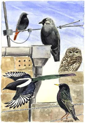 |  |  Star  Hausrotschwanz  Elster  Dohle  Steinkauz  Starenschwarm jagt einen Sperber